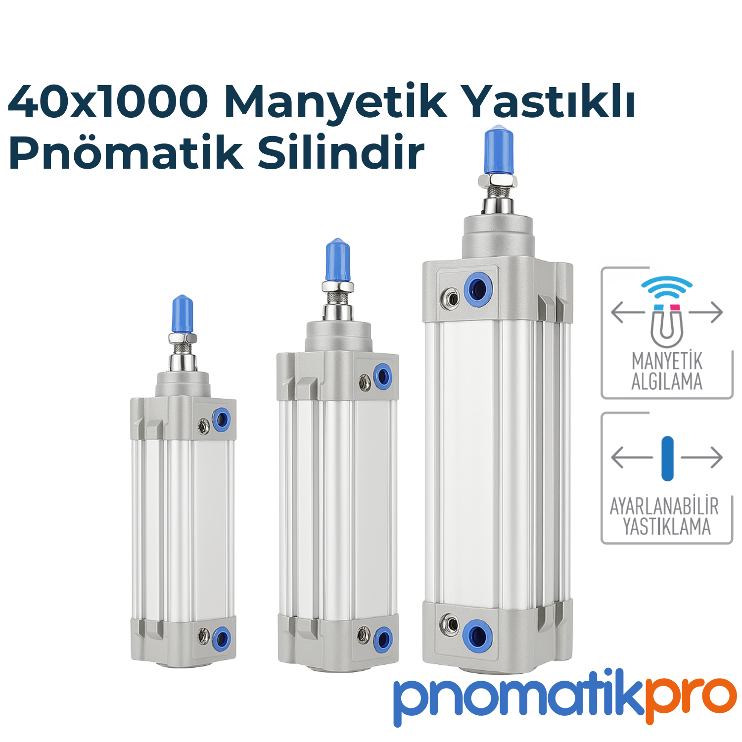 40x1000 Pnömatik silindirler, endüstriyel otomasyon uygulamalarında yüksek tekrarlanabilirlik ve stabil performans için tasarlanmış manyetik yastıklı pnömatik silindir serisidir. Ø40 mm piston çapı ile 1000 mm strok sunar; manyetik piston sayesinde sensörlerle konum algılama yapılabilir.