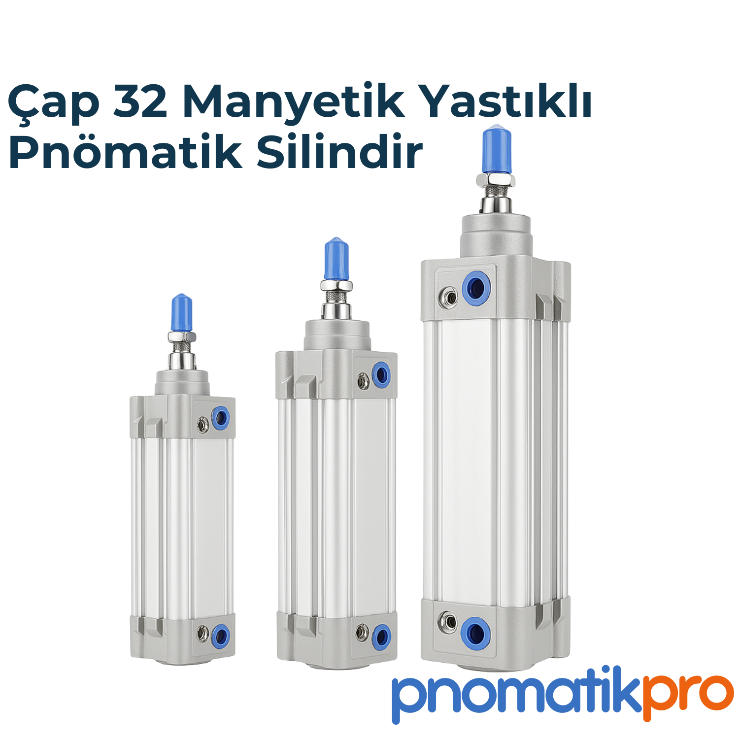Çap 32 Pnömatik silindirler, endüstriyel otomasyon uygulamalarında yüksek tekrarlanabilirlik ve stabil performans için tasarlanmış manyetik yastıklı pnömatik silindir serisidir. Ø32 mm piston çapı ile geniş strok seçenekleri sunar; manyetik piston sayesinde sensörlerle konum algılama yapılabilir.