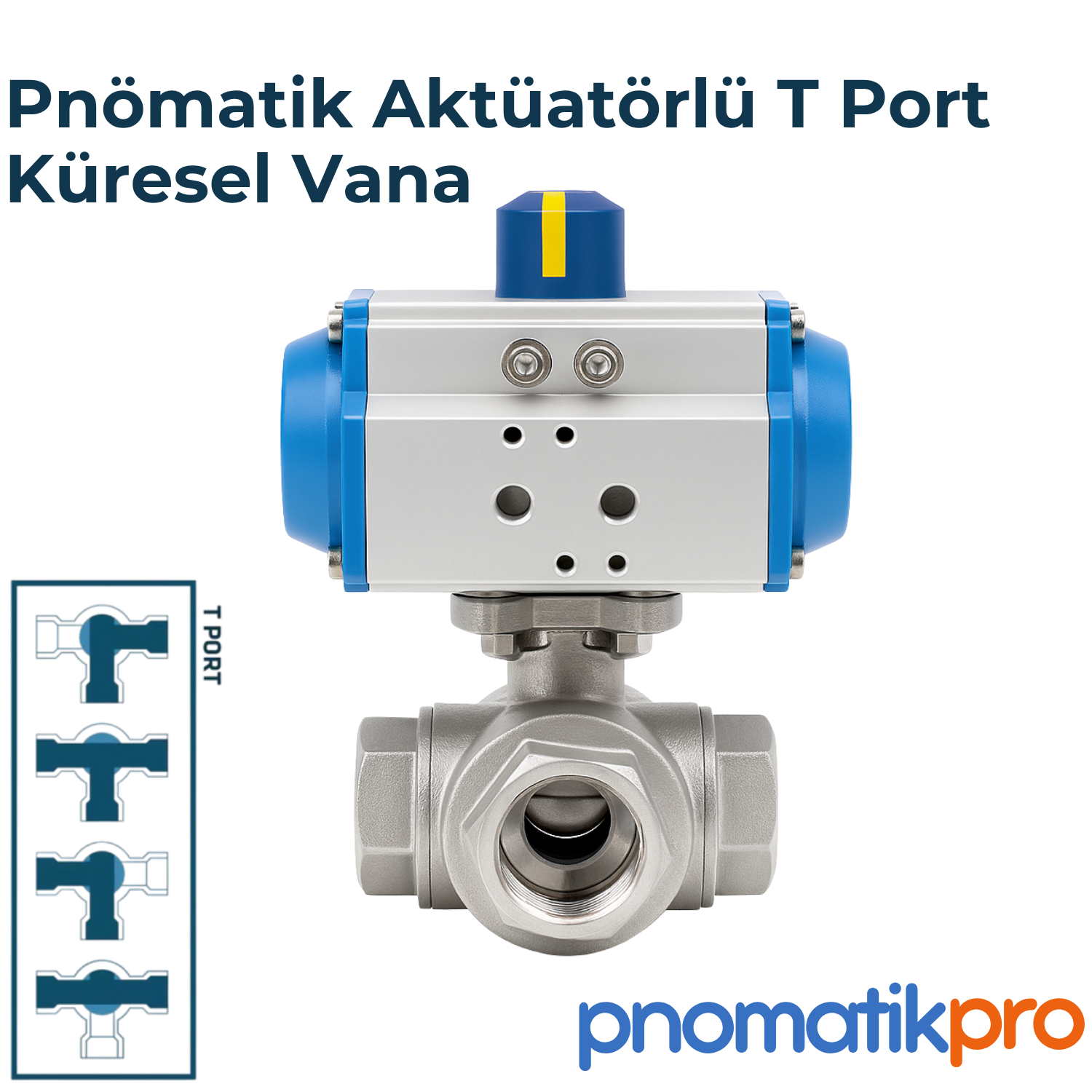 T port (3-yollu) paslanmaz küresel vana, tek vana ile karıştırma, dağıtma ve baypas konfigürasyonlarını mümkün kılar. Üstüne monteli pnömatik aktüatör ile otomasyona uygundur; proses hatlarında güvenilir sızdırmazlık ve uzun servis ömrü sunar.